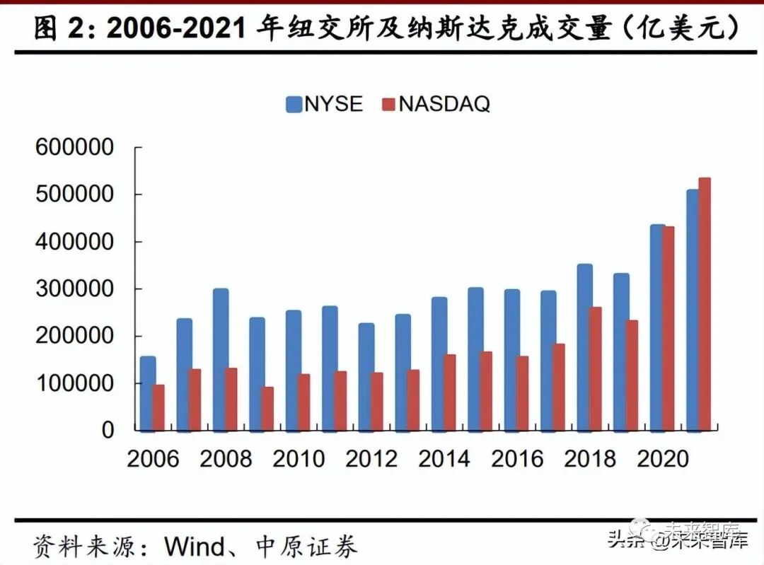 目前全球大多数资本市场已采用做市商制度,包括纽约证券交易所、纳斯达克、伦敦交易 所、德意志交易所、香港交易所等,其中美国多层次资本市场完善、产品种类丰富、市值及成 交量领先全球,更具代表性和借鉴意义。做市商制度起源于场外市场,兴起于场内市场。19 世纪后美国资本市场的快速崛起为做市 商机制的不断发展完善提供了肥沃的土壤,进而逐步形成了两类具有代表性的做市商制度,即 纽约证券交易所的垄断性做市商制度和纳斯达克的竞争性做市商制度。