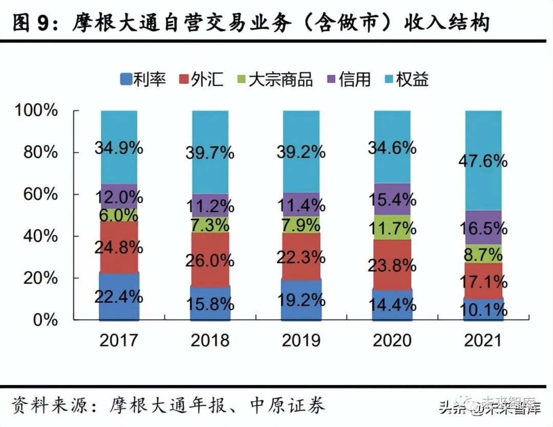 从大类资产分类看,美国大型投行做市交易业务的布局各有不同。花旗集团在利率、外汇、 大宗商品、信用等 FICC 类资产自营交易收入(含做市)总计占比显著高于权益类做市业务收 入占比,2017-2021 年分别达到 94.1%、85.0%、90.9%、90.3%、78.4%;此外,摩根大通FICC 类资产自营交易收入(含做市)占比也稳定在 50%以上。高盛集团更侧重于权益类资产 的做市,权益类做市业务收入绝对金额领先于其他三家大型投行,收入金额与收入占比呈现出 与权益类资产特征类似的相对高波动性。美国银行近年来在权益类资产做市方面持续发力,收 入金额及收入占比总体呈现提高的态势。