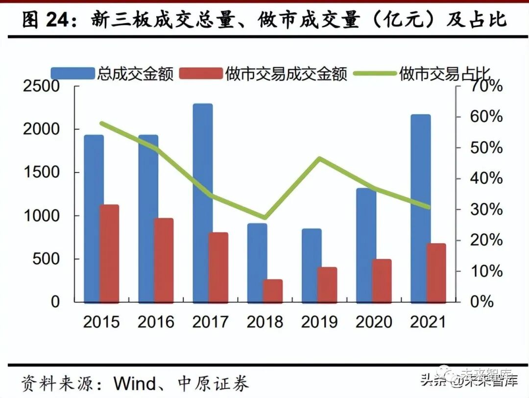 新三板做市业务。新三板挂牌企业偏早期,普遍存在规模小、盈利能力弱等问题,叠加投 资者门槛高,新三板长期以来面临流动性不足的问题。2014 年新三板引入做市商制度,流动性 一度出现明显改善,但受制于权益市场行情,新三板的总成交金额以及做市交易成交金额波动 较大。新三板做市交易成交金额在做市制度引入后的首年,即 2015 年达到最高的 1106.75 亿 元,之后便持续下降,并于 2018 年创 242.57 亿元的低点,2019-2021 年出现缓慢回升。成交 占比方面,2015 年新三板做市交易成交金额占比达到 57.93%的历史峰值,2018 年创 27.32% 的低点,2019-2021 年成交金额缓慢回升但成交占比持续下降。
