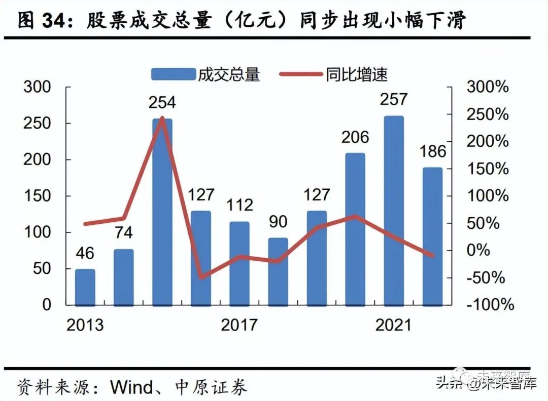 全年日均成交量有望在当前水平上下波动。首先,2022 年资本市场表现持续弱势,1-10 月沪、深两市日均股票成交量为 9416 亿元,较 2021 年日均成交量水平下滑 11.06%,下滑幅 度尚在合理的范围内。其次,在后疫情时代经济复苏基础尚不牢固、全球及国内经济形势依然 复杂严峻的背景下,2023 年整体流动性仍有望保持相对充裕;叠加持续引入长线资金、居民储 蓄有序转化、房地产资金寻求高收益资产等因素,权益市场的增量资金仍有保障,但是否入市 需要市场行情配合;