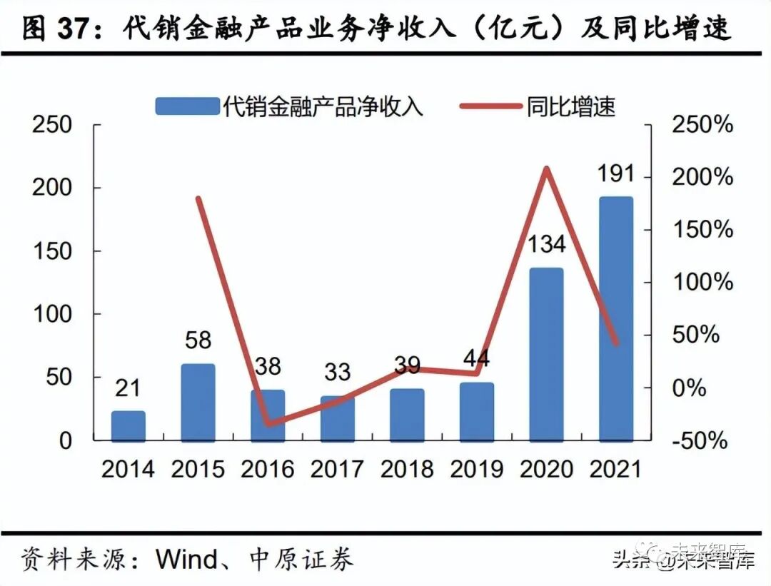 代销金融产品业务在经历大幅增长后出现较大幅度下滑。2020 年以来,传统经纪业务加 快向财富管理转型。根据中国证券业协会的统计,2020 年行业共实现代销金融产品业务净收入 134.38 亿元,同比增逾 2 倍。2021 年,伴随着公募基金的蓬勃发展,行业向财富管理转型持 续发力,当年实现代销金融产品业务净收入 190.75 亿元,同比进一步增长 41.95%。进入 2022 年,受资本市场持续弱势的影响,以公募基金为代表的权益类金融产品收益率 表现不佳,居民借道公募基金进入权益类市场的步伐明显放缓。根据 Wind 的统计,2022 年 1-10 月,新发基金份额为 1.18 万亿份,同比大幅下滑 53.53%,行业代销金融产品业务净收入 在经历 2020 年、2021 年连续 2 年的快速、大幅增长后,预计 2022 年将出现较大幅度下滑。