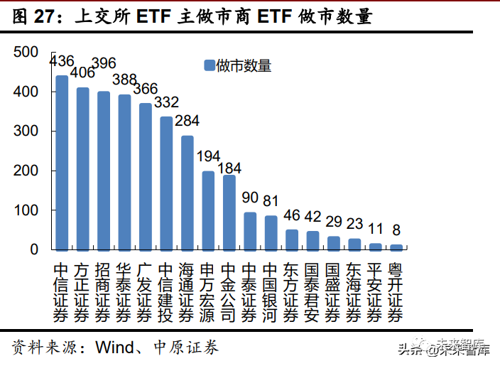 从目前我国已引入做市商机制的金融细分领域看,同样出现集中度较高的现象。我们选取 银行间债券市场做市和交易所 ETF 做市两个准入门槛相对适中的领域对此进行验证。银行间债 券市场做市方面,债券交割量排名前 5 位券商的集中度由 2016 年的 26.32%提升至 2021 年的 31.34%,排名前 10 位券商的集中度由 2016 年的 42.87%提升至 2021 年的 48.15%。2021 年 债券交割量排名前 10 位的证券公司分别为中信证券、中金公司、山西证券、华泰证券、东方 证券、国泰君安、招商证券、中信建投、平安证券、广发证券,头部券商占据 7 席。