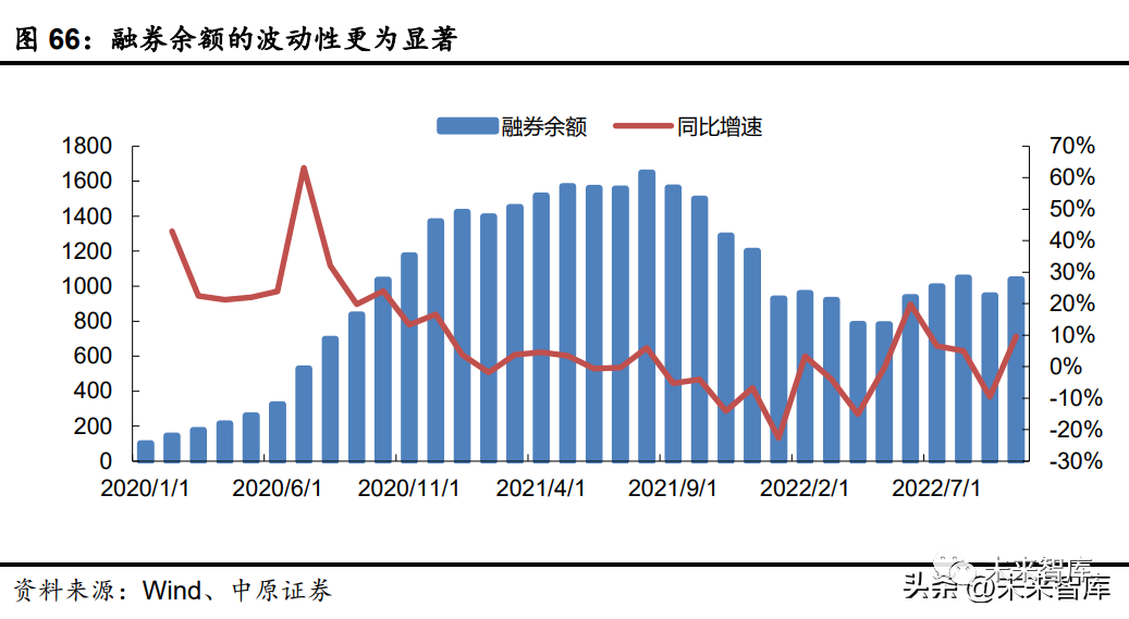 融券业务的波动性更为显著。在两融标的扩容、注册制下股票上市首日即可融券、多方面扩大券源供给的多重政策推动下,2020 年以来融券业务呈现出快速发展的态势,2021 年 8 月 底融券余额曾达到 1649 亿元的历史峰值。进入 2022 年,伴随着资本市场持续弱势,市场整体 估值水平较 2021 年出现明显下降,融券规模也同步出现较为明显的减少。截至 10 月底,2022 年融券月均规模为 934 亿元,较 2021 年 1473 亿元减少 36.59%。从 2021 年以来融券余额与 市场走势的关系看,融券余额变化与市场行情变化的契合度较高,波动性显著高于融资余额, 且具有一定的前瞻性,显示参与融券交易投资者的交易态度更为积极,交易手段更为灵活,对 于市场脉动的把握相对更加精准。