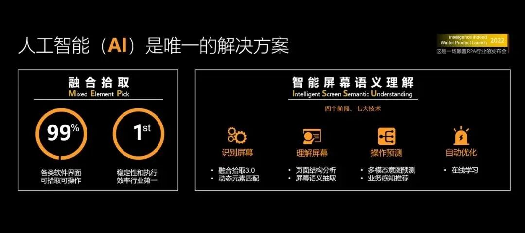 表面上,正如前文提到的,IPA模式是将RPA从“托拉拽”变为“点选用”,逼近低代码的终极形态,使其人人可用。而从底层技术看,孙林君谈道,这是AI算法和RPA去结合的一个典型应用,AI从底层改变了RPA形态。从近期实在智能的技术发布可以加深了解,也就是IPA模式背后的自研创新技术——智能屏幕语义理解技术体系(ISSUT:Intelligence Screen Semantics Understanding Techonology)。![]()