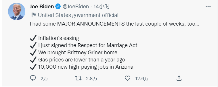 虽然本人信心满满,但可以想象到的是,这样的举动立刻引来了不少政客和媒体的冷嘲热讽,现任美国总统拜登就在推特上发文讽刺,他表示“过去几周我也有一些重大声明,比如缓解通胀、增加了就业机会、降低油价等”。
