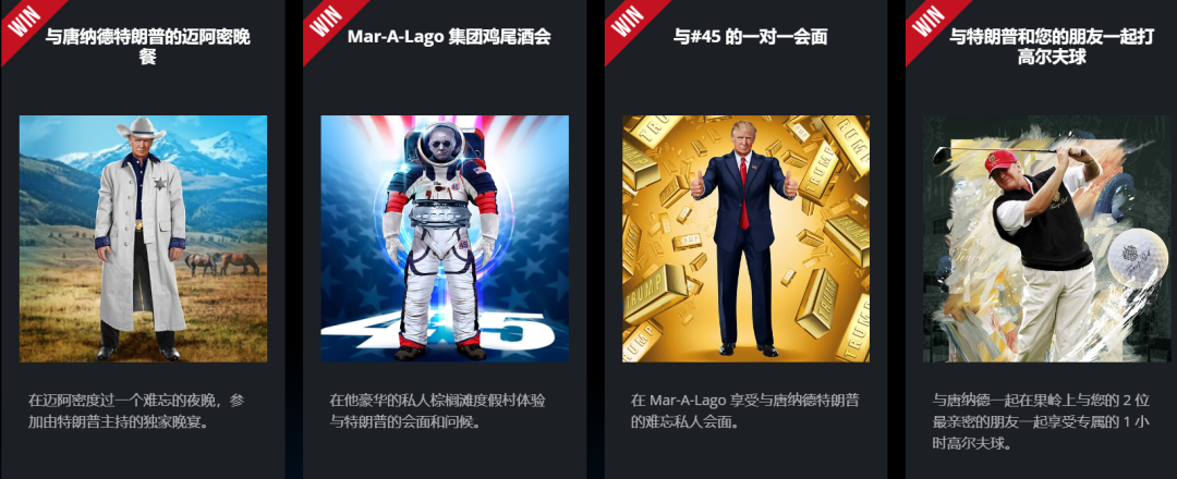 为了更好地卖出卡片,官网上甚至还设立了不同奖项的抽奖活动,当然最终的奖励也基本都和特朗普本人有关,比如“与特朗普视频通话”、“与特朗普一起打高尔夫”、“与特朗普一起参加私人酒会”等等。