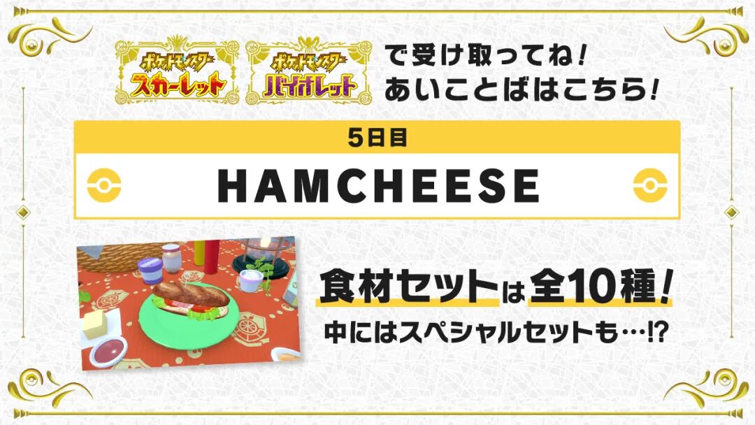 官方发布《宝可梦 朱/紫》第五天食材神秘礼物兑换码【HAMCHEESE】,内容为“食材套装10种(随机)”。