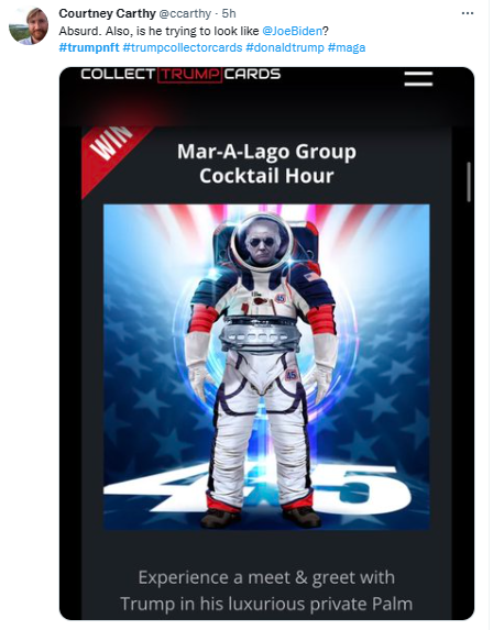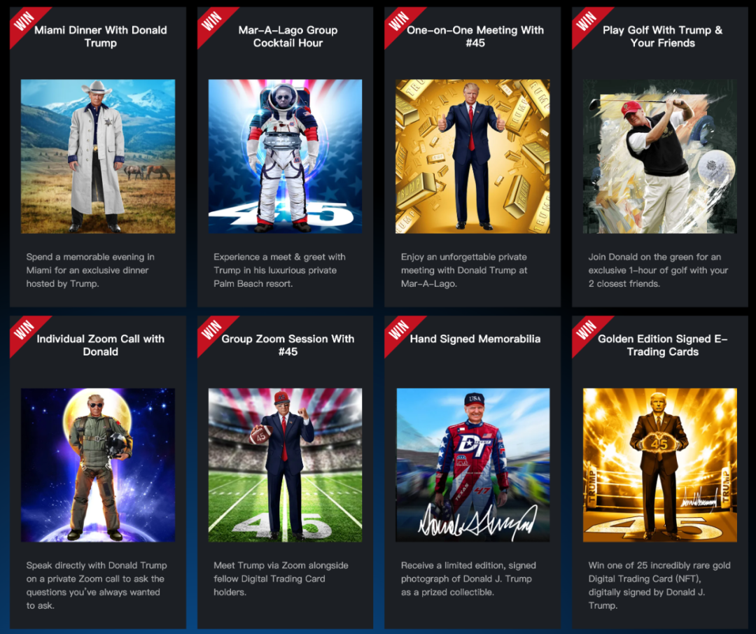 另外,购买该NFT还有多项“福利”,如购买即可参与抽奖,奖品包括和特朗普在迈阿密共进晚餐、海湖庄园鸡尾酒会、一对一的会面、和特朗普一起打高尔夫、亲笔签名纪念品等等。