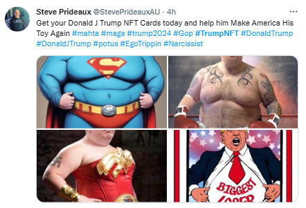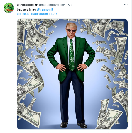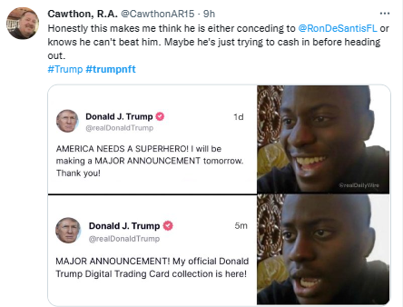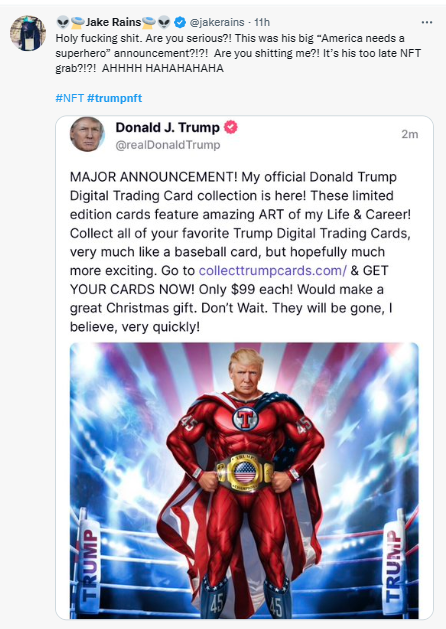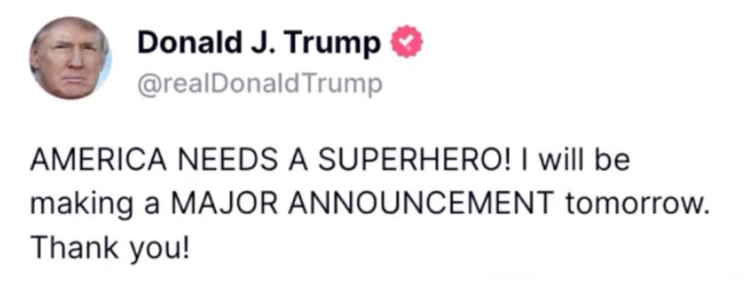 在正式发布NFT前,特朗普曾在其自创社交平台“TRUTH”上发消息称:“美国需要一个超级英雄!我在明天将发布一项“重大公告”。谢谢!”