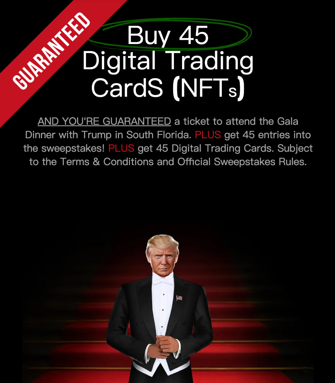 购买45份NFT可以直接获得一张在南佛罗里达州与特朗普一起参加晚宴的门票。