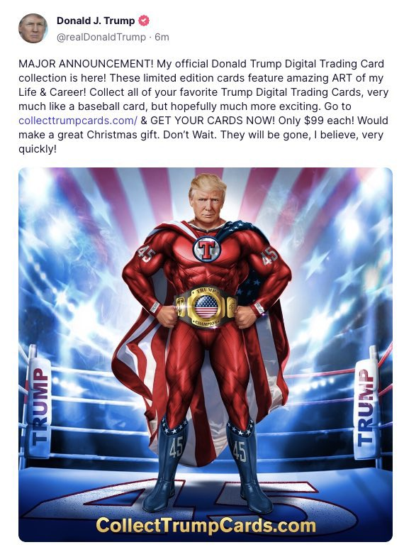 昨日,美国前总统唐纳德·特朗普宣布推出系列数字交易卡 (NFT),这些限量版的卡片以特朗普的传奇人生为主题。特朗普称,收集数字交易卡,就像收集棒球卡一样,每张只需99美元,这将是一个非常好的圣诞礼物。