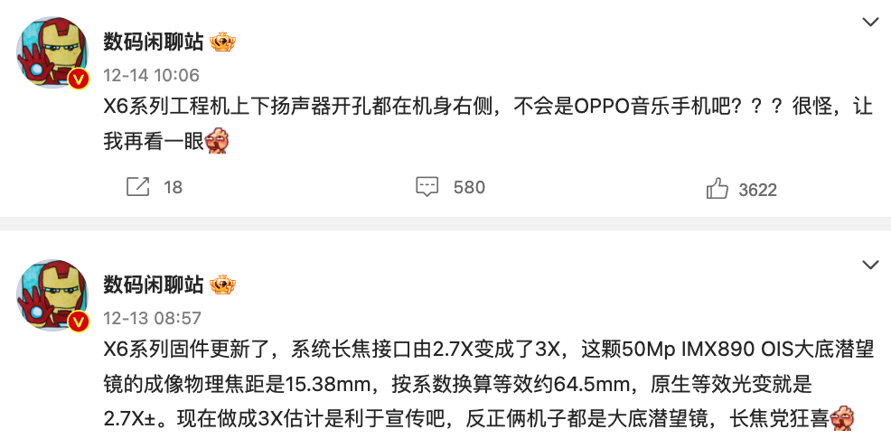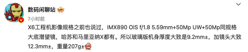 而随着这两款折叠新机的正式亮相,不少用户也将关注集中在了下一代的OPPO Find X系列产品上。今天,博主@数码闲聊站 在最新的爆料中提到,“X6工程机影像规格之前也说过,IMX890 OIS f/1.8 5.59mm+50Mp UW+50Mp同规格大底潜望镜,哈苏和马里亚纳X都有。所以玻璃版机身厚度大致是9.2mm±,加镜头大致12.3mm±,重量207g±”结合其中的产品细节来看,这款爆料中提到的新机应该就是新一代的OPPO Find X6。也就是说,OPPO Find X6有望搭载一颗5000万像素的 IMX890主摄,支持OIS光学防抖,还将配备一颗5000万像素超广角镜头,一颗5000万像素大底潜望镜头。同时,这款新机还将获得哈苏支持,并搭载马里亚纳X自研芯片。在此基础上,其有望采用玻璃材质机身,厚9.2mm左右,重207g左右。来自同一位博主的爆料还曾提到,“X6系列固件更新了,系统长焦接口由2.7X变成了3X,这颗50Mp IMX890 OIS大底潜望镜的成像物理焦距是15.38mm,按系数换算等效约64.5mm,原生等效光变就是2.7X±。现在做成3X估计是利于宣传吧,反正俩机子都是大底潜望镜”“X6系列工程机上下扬声器开孔都在机身右侧”等细节信息。结合来看,即将到来的OPPO Find X6应该会带来影像方面的全新升级。与之对比,前代产品OPPO Find X5系列后置 5000万像素主摄、5000万像素超广角镜头、1300万像素长焦镜头组合,前置 3200万像素镜头。且同样获得了马里亚纳MariSilicon X、哈苏影像等技术加持。一直以来,OPPO Find X系列都提供了OPPO旗下的高端旗舰级别技术支持,影像表现比较不错。就此来看,新一代的OPPO Find X6实际表现也令人期待。