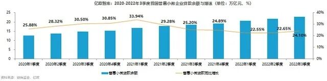 根据银保监会公布的数据,截至2022年9月末,全国小微企业贷款余额58.04万亿元,其中普惠型小微企业贷款余额22.93万亿元,同比增速24.10%,较各项贷款增速高13.18个百分点,有贷款余额户数3811.04万户,同比增加626.39万户。