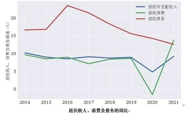 我们再从居民的消费、债务、可支配收入的增速来看(见图10),从2016年以后,居民部门的债务增速是一路下行的,从2016年的20%多,一路降低到2021年的10%出头。