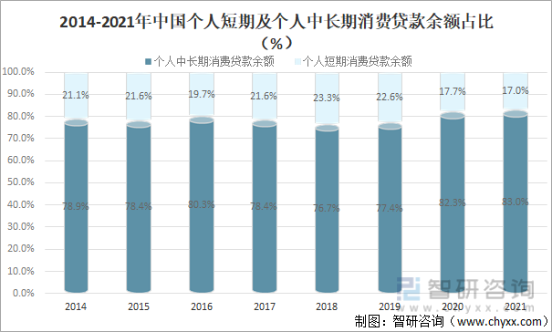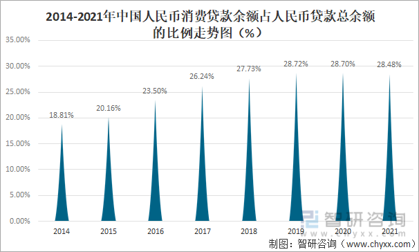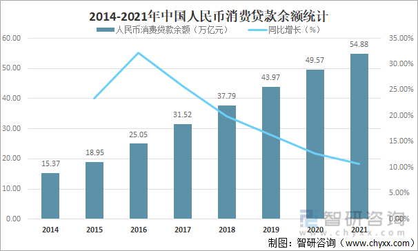 图11是2014年-2021年的消费信贷余额及增速统计,我们可以清晰的看到从2014年开始,消费信贷呈现出超高速增长的态势,增速在2015、2016年到达顶峰,一路飙升超过了50%,如果持续如此,当然是巨大的风险,但从2017年开始,增速逐年下降,到2021年甚至跌到了10%以下。