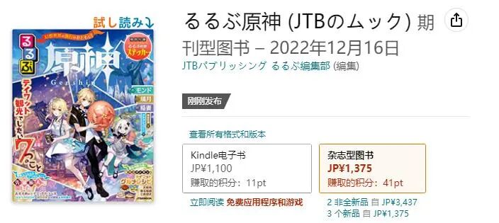 12月16日,《原神》和日本旅行社巨头JTB旗下的RURUBU旅游杂志合作,推出了名为《Rurubu Genshin》的旅行杂志,并于同一天上架发售。其中,杂志实体版价格为1375日元(约合69元人民币),电子版则为1100日元(约合55元人民币)。