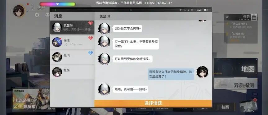在本次测试,除了基础的主线和支线任务外,游戏并未开放其他玩法,勉强算的上的就一个很普通的【通讯】系统,除了好感度外基本上附带解说一些游戏的背景与设定,没有特别的东西。