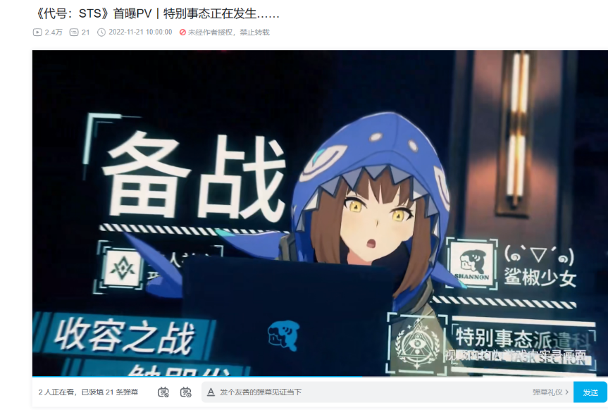 我最早关注到《代号:STS》也不是游戏的PV、测试、新闻,而是有同行在朋友圈丢了一个意义不明的链接。那是半年前的事儿,点进去是一个名为【涂凌会吐泡泡】的UP主,一个穿着可爱的鲨鱼卫衣可爱少女?总之看不出和游戏有任何联系,但【涂凌会吐泡泡】足够可爱,会卖萌,有些天然呆,所以很长一段时间我都把她当作一个虚拟偶像企划起看待。