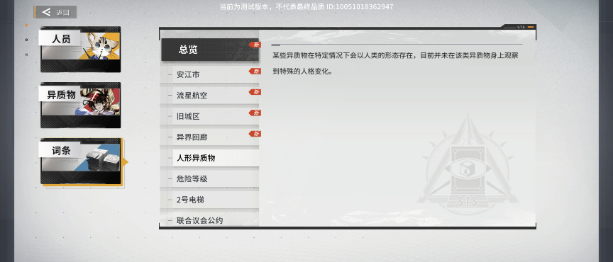 怎么说呢,《代号:STS》想要凸显角色在SCP、怪异、神秘学上的特点,所以尽可能在角色设计上增加属于这些内容的元素。比如角色也就是【异质物】的命名,基本上大部分都非人名,而是由其背后的标志性物品或者事件所代称。