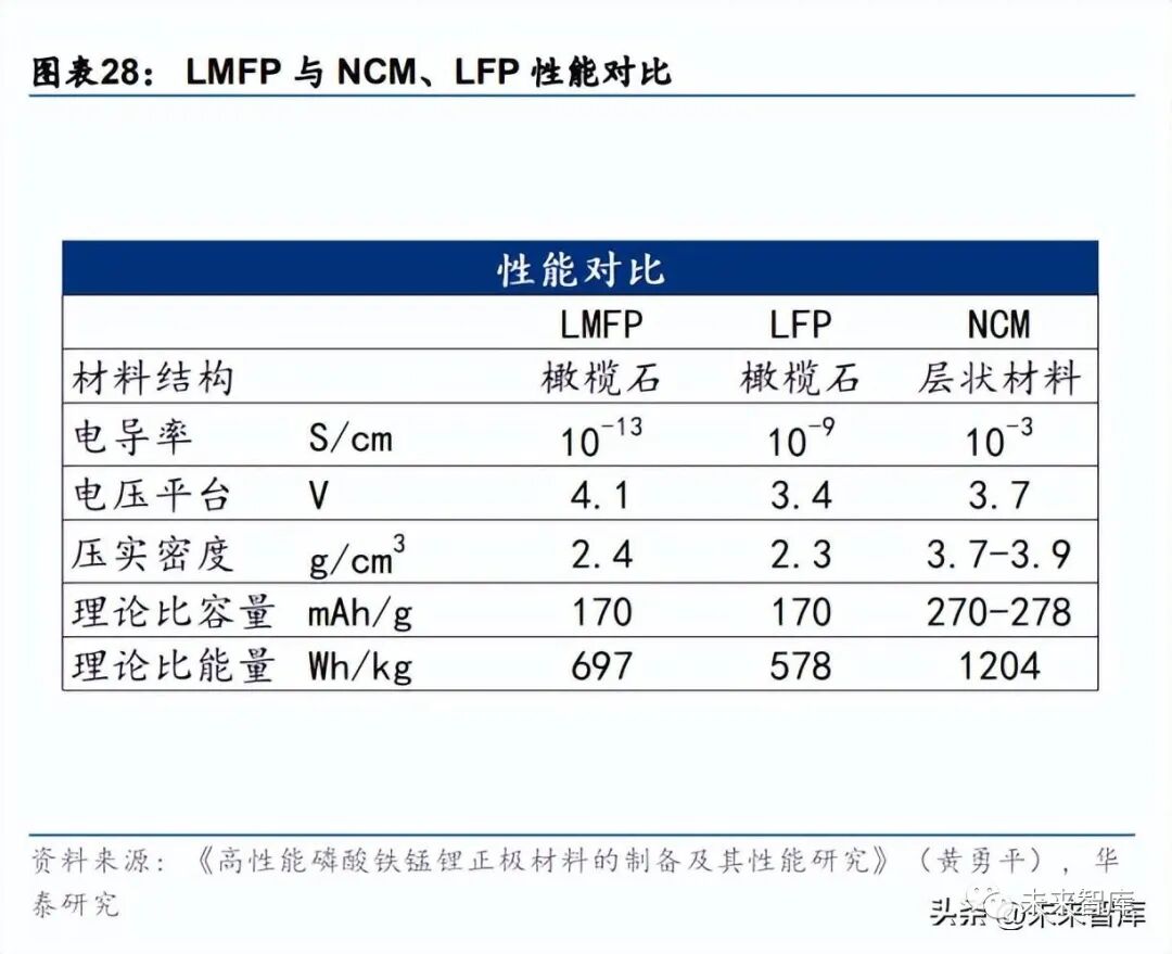 特斯拉推动下,4680 大圆柱电池量产在即。4680 大圆柱电池一致性好,生产成本较低, 且散热性能较好,是搭载高镍三元与硅基负极以提升能量密度的最佳方案之一。我们认为 大圆柱电池未来更适配追求高能量密度,单车带电量大的高端车型,特斯拉积极推动大圆 柱电池应用普及,Q3 月装车量达到 1000 辆/周,随着德州工厂新生产设备投产,产能预计 进一步爬升,松下与亿纬锂能也有大圆柱电池产能规划,预计随着生产工艺进一步成熟, 大圆柱电池将在高端车型快速推广。磷酸锰铁锂能够在提高电压的同时保持低原料成本,明年有望推向市场。磷酸锰铁锂(LMFP) 是在磷酸铁锂中加入锰元素以提高电压,其晶体具有橄榄石型结构,稳定性高。磷酸锰铁 锂不仅具有磷酸铁锂低成本、高安全、长寿命的特性,同时通过改变锰铁比能够改善磷酸 铁锂的能量密度缺陷,能量密度能够达到接近 5系NCM的水平。但是材料充放电能力受限, 目前已有许多新的工艺合成路线能够有效解决磷酸锰铁锂电导率较低的问题。通过采用减 小颗粒尺寸、导电物质包覆、体相离子掺杂、材料结构设计与形貌调控等单一措施或者利 用多种措施的协同作用能够对 LFMP 进行有效的性能改良。随着技术的持续发展,未来其 应用范围有望实现大幅拓宽。目前宁德时代为代表的电池企业正积极推动磷酸锰铁锂商业 化应用,宁德时代已量产 M3P 电池,预计最快将于明年推向市场应用。
