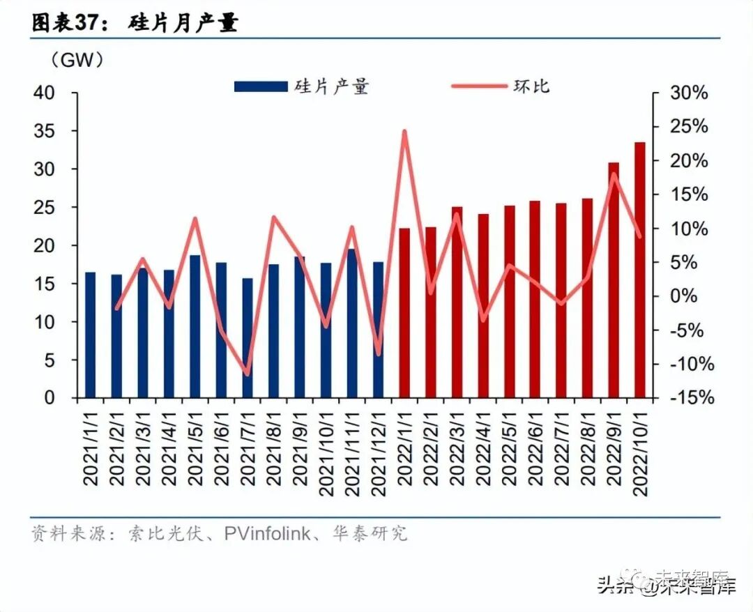硅片价格方面,从 2021 年至今价格持续上涨。以单晶 182 硅片为例,假设其单片功率为 7.6W,则价格已达 0.89 元/W,主要系下游景气下硅料短缺导致价格上涨。22H1 隆基与中 环的出货国内市占率达 51%,竞争格局集中带来强顺价能力,硅片环节价格传导较为顺畅, 价格随着硅料价格持续上升。硅片产量方面,22年1月起开工率提升带动硅片产量上行,22年1月国内硅片产量20.6GW, 环增 15.4%。受益于下游高景气和产能释放,硅片产量 3 月达 25GW。之后由于疫情影响 部分企业产量减少,硅片产量 4 月为 24.1GW。之后生产节奏逐步恢复。进入 Q4 后随着硅 料产能释放,硅料产量上升供应瓶颈缓解,导致硅片开工率提升,9/10 月硅片产量达 30.8/33.5GW,环增 18/9%。