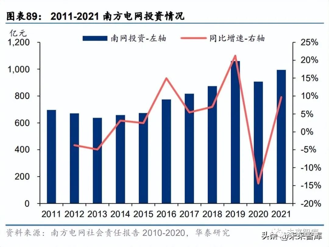 数字化是协助提升电网能力的核心,软硬件结合共同推进新型电力系统。电网数字化通过 利用物联网、大数据、智能 AI、云计算等技术实现电源侧、负荷侧、储能侧的各类可控资 源的数据接入、数据处理,没有电网数字化转型就没有新型电力系统。在国家电网发布的 《新型电力系统数字技术支撑体系白皮书》中,新型电力系统数字技术支撑体系整体分为 “三区四层”,即生产控制大区、管理信息大区和互联网大区,以及数据的采、传、存、用 四层。“十四五”期间南方电网公司将进一步加快电网数字化转型步伐,以电网的数字化、智能 化建设,促服务智慧化,全力提升用户获得感。针对发输配变用等硬件基础设施,深化保 底电网(坚强局部电网)建设,加快提升输电智能化水平,推进输电线路智能巡视和智能变电 站建设,到 2025 年,35 千伏及以上线路实现无人机智能巡检全覆盖。配电领域推动以故 障自愈为方向的配电自动化建设,有效实现配网状态监测、故障快速定位、故障自动隔离 和网络重构自愈。用电侧关注需求侧响应,促进电动汽车充电基础设施发展及车网互动, 推动智能家居与智能小区建设。