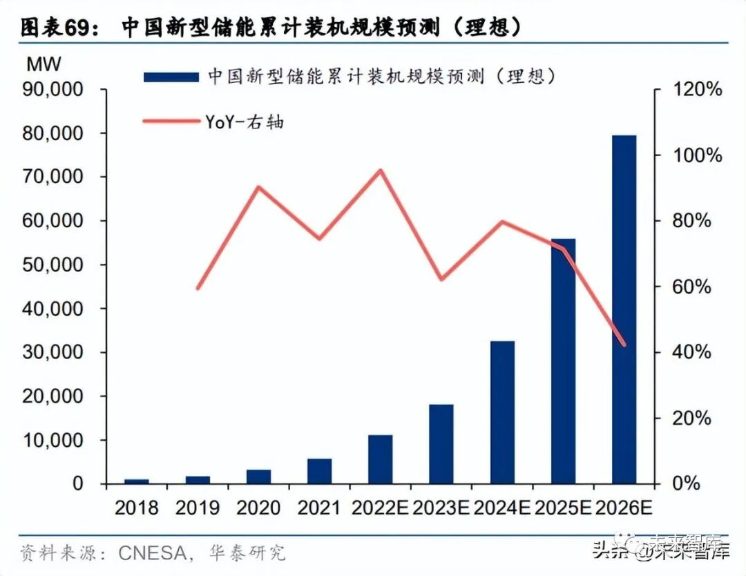 政策给予倾斜,配储要求加严,支撑整体需求。2021 年 7 月国家发展改革委、国家能源局 发布了《关于加快推动新型储能发展的指导意见》,“大力推进”发电侧储能,“积极推进” 电网侧储能,“积极支持”用户侧储能,发电储能核心地位不变。意见中针对新能源配储项 目,在项目核准备案、并网以及运营中调度、保障利用小时数和辅助服务补偿上均给与政 策倾斜,激发发电侧自发性配置需求。我们预计随着地方细则逐步落地,发电侧和共享储 能方均将受益,国内商业模式有望理顺。新能源配储考核力度加强,有望减少行业劣币驱 逐良币现象。中国市场在保守/理想情景下,22-26 年新增装机规模 CAGR 分别有望达到 39.7%/57.4%。CNESA 在《储能产业研究白皮书 2022》中预测,未来中国新型储能市场,在保守情况下, 预测 22/23 年新增装机规模为 3.8GW/5.7GW,预计 2022 年累计装机规模为 9.5GW,在 2026 年累计装机规模将达到 48.5GW,预测 22-26 年新增装机量 CAGR 为 39.7%;在理想 情况下,预测 22/23 年新增装机规模为 5.5GW/7.0GW,预计 2022 年累计装机规模将达到 11.2GW,2026 年规模可达 79.5GW,预测 22-26 年新增装机量 CAGR 为 57.4%。