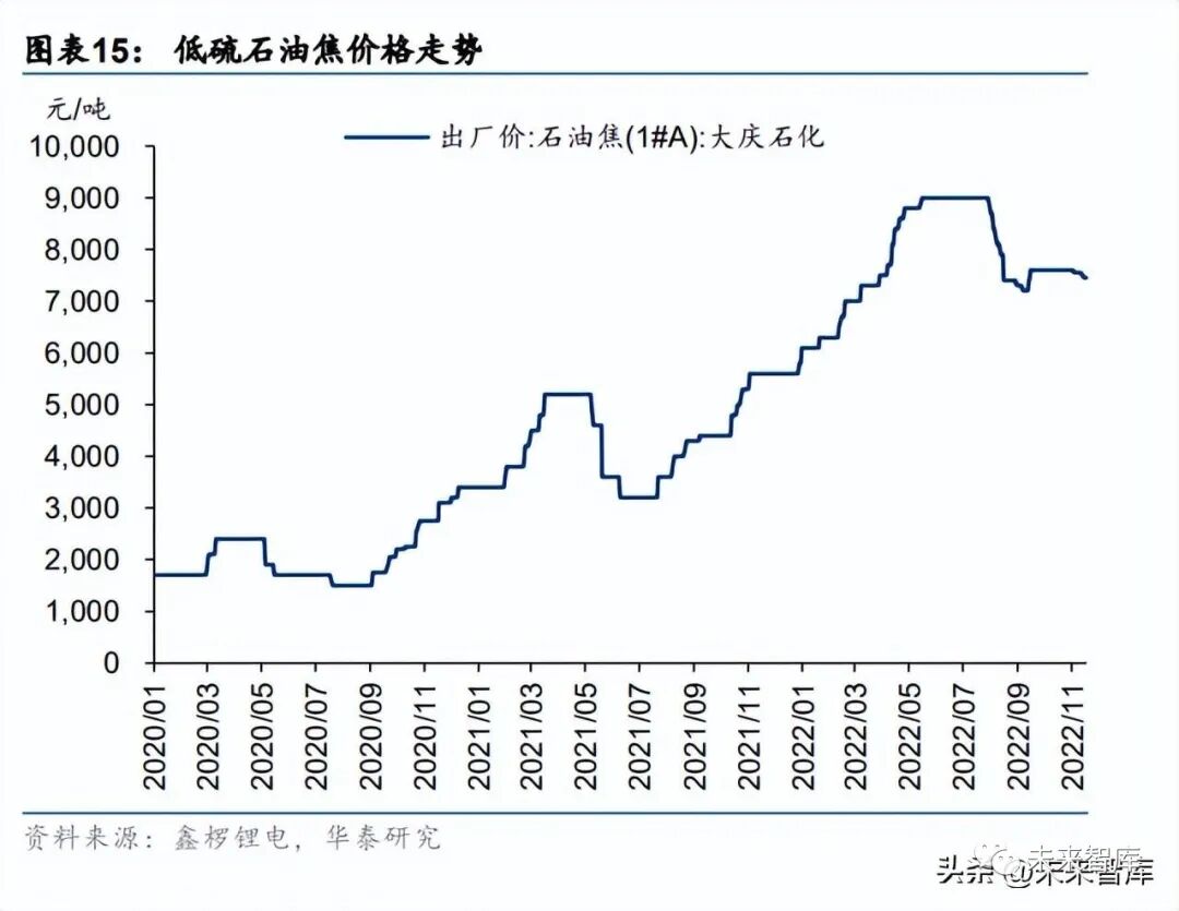 Q3 石墨化以及原材料价格回落带动人造石墨负极价格下降,预计后续随石墨化价格下降将 逐渐降价。今年石墨化价格持续走高推动人造石墨负极价格上涨。今年 8 月,石墨化价格 开始松动下行,月均价从年内高点 2.8 万元/吨降至 10 月的 2.35 万元/吨。按 1 吨负极成品 对应 1.1 吨石墨化需求计算,8-10 月石墨化价格变动使负极成本下降 4950 元/吨。同时, 低硫石油焦价格 8 月以来也开始下行,使得人造石墨负极价格 10 月均价略有下调。展望明 年,石墨化释放增加,预计石墨化价格或将持续走低,带动负极价格下降。