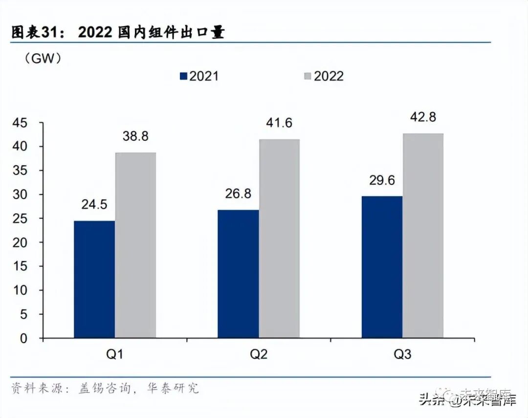 根据能源局数据,2022 年 1-9 月,中国新增光伏装机 52.6GW,同比增长 106%,主要系 硅料价格供应不足且价格处于高位,终端接受度不足导致装机量较少。中国光伏组件出口 121.5GW,同比增长 89%,主要系受到能源危机与电价飙升影响,海外市场持续景气,欧 洲地区最为旺盛,同时新兴国家如巴西、印度等需求上升。
