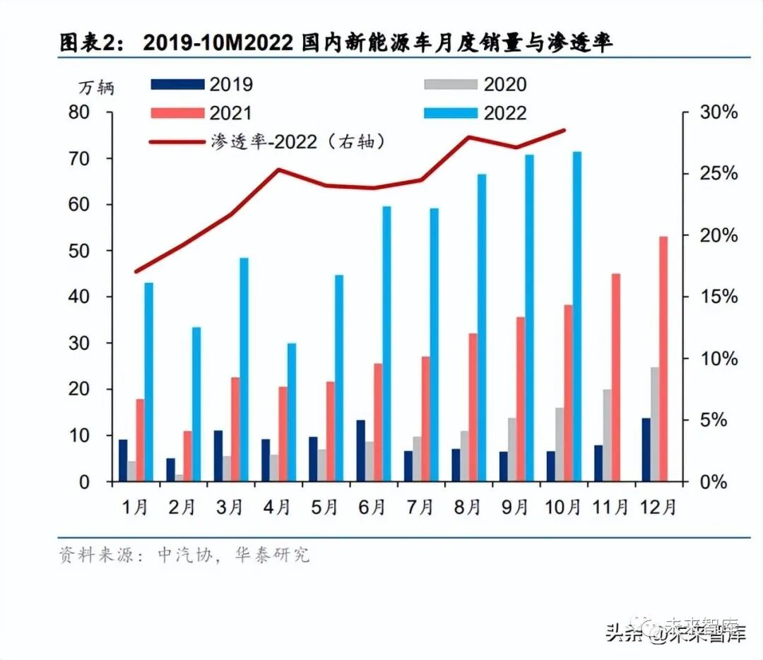 政策退坡影响有限,优质供给驱动增长,国内新能源车渗透率保持提升。根据中汽协数据, 22 年 10 月国内新能源车销量 71.4 万辆,同比+86.4%,渗透率 28.5%,同比+12.1pct,1-10 月新能源车累计销量 527.1 万辆,同比+108.7%,渗透率达到 24%。22 年至今国内新能源 车销量同比实现大幅增长,销量及渗透率持续稳步提升。22 年对于续航超 400 千米的普通 纯电动车购置补贴为 1.26 万元,插电式混动车型补贴为 4800 元,该补贴将于 22 年后正式 取消,购置税免征政策则延续至明年底。我们认为国内市场已进入内生增长阶段,主要由 供给驱动,政策补贴对于中端及高端车型影响较小,预计政策面对需求影响有限。新能源车产品力提升,中端车型有望成为主要增量来源。根据乘联会,10M2022 国内 A、 B 级乘用车占销量 75%,但作为国内汽车市场主体的 A、B 级车型,新能源车渗透率目前 仍较低。22 年 1-10 月 A00、A0、A、B、C 级以上新能源车渗透率分别为 99.9%、32.5%、 18.2%、22.2%、33.6%,呈现“中间低,两端高”的特点。明年传统车企以及新势力车企 仍将推出一系列以中端为主的新车型,比亚迪海洋、军舰、腾势及全新高端车型仰望汽车 均有新品开启交付,小鹏 High-power charging BEV、中高端车型,蔚来 ES8 新版、ES6 新版、EC6 轿跑版等新车型也计划于明年上市,推动新能源车渗透率进一步提升。
