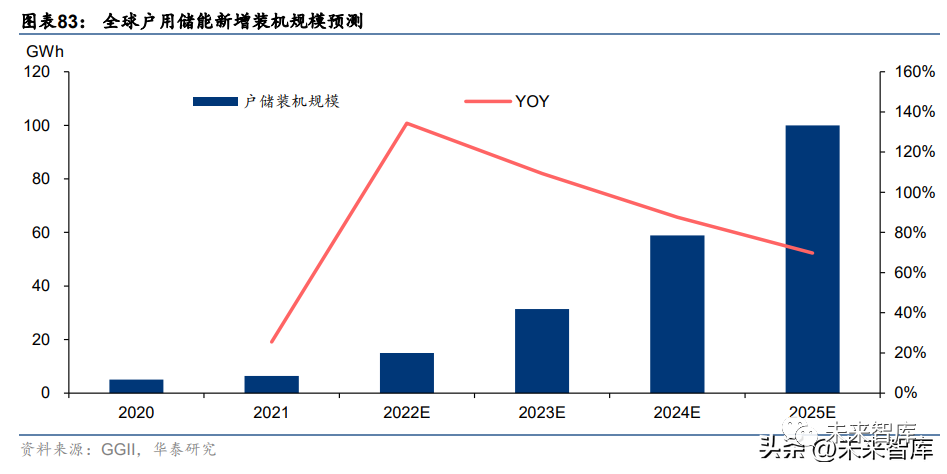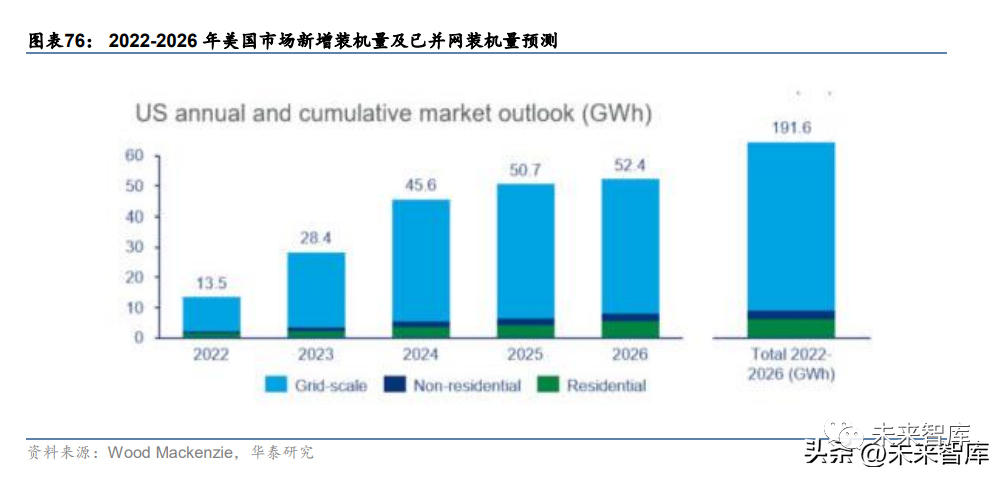 Wood Mackenzie 预测美国储能市场将在 22-24 年实现超高速增长。据 Wood Mackenzie 预测,2022 年及 2023 年美国储能新增装机量将分别达到 13.5GWh 及 28.4GWh;2022- 2026 年美国储能累计新增装机量将达到 191.6GWh。