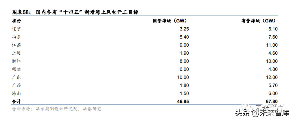 从开工规划看,据华东勘测设计研究院统计,我国“十四五”期间新增开工目标合计 114.65GW,其中省管海域 46.85GW,国管海域 67.80GW,已超过“十四五”期间海风新 增装机规划,说明实际装机量仍有上浮空间。