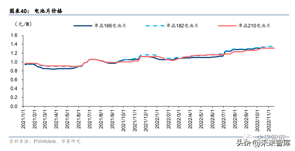 电池片价格方面,从 2021 年 6 月至今价格经历两次上涨趋势,从 21 年 6 月持续至 21 年 12 月,以单晶 182 电池片为例,其价格由 0.96 元/W 上升至 1.16 元/W,主要系下游持续 景气。而 2022 年 1 月电池片价格有所回落,主要系电池片产量大幅增加,产能放量导致。22 年 2 月起价格再度上涨,主要受益于下游装机景气和电池片技术迭代下大尺寸电池的短 缺。