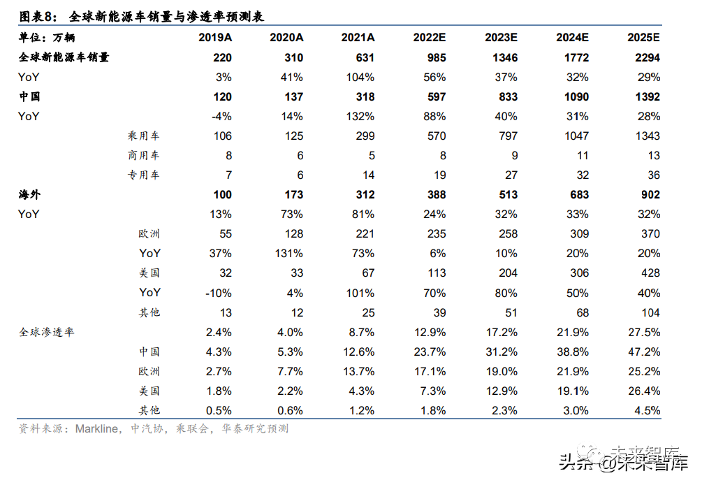 我们预计全球 22-25 年新能源车销量 CAGR 达到 38%,动力电池装机量 CAGR 为 50%。考虑中国市场新能源车渗透率保持较快提升速度,我们预计 25 年中国新能源车销量将达到 1392 万辆,渗透率达 47.2%,2022-2025 年 CAGR 45%。考虑美国《减少通货膨胀法案》 (IRA)等政策支持,预计 25 年美国新能源车销量将达到 428 万辆,渗透率达 26.4%, 2022-2025 年 CAGR 59%。考虑欧洲高通胀及供应链短缺问题,我们略下修 23-25 年欧洲 新能源车销量至 258/309/370 万辆,2022-2025 年 CAGR 14%。受益于下游市场拉动,我 们预计 2025 年全球动力电池装机量有望达到 1486GWh,2022-2025 年 CAGR 50%。