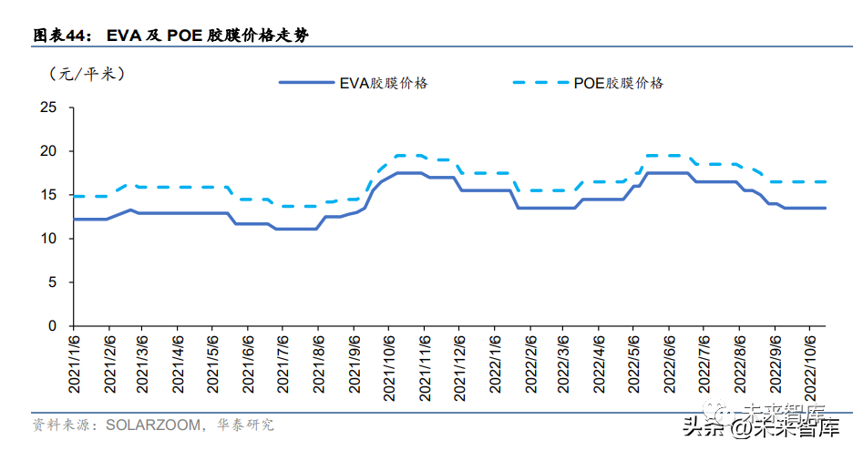 受多方面因素影响,22 年胶膜价格季度间波动较大。22Q1,由于龙头企业主动降价,其他 胶膜厂跟进,一季度 EVA 胶膜从年初 15.50 元/平米下降至最低 13.50 元/平米,胶膜企业 利润受损。二季度以来,俄乌战争引发的欧洲能源危机,来自欧洲的光伏需求提升,下游 需求旺盛带动胶膜价格上涨,EVA 胶膜从 13.50 元/平米涨至最高 17.50 元/平。三季度以来, 硅料价格持续高位,下游需求增长乏力,叠加非光伏级 EVA 粒子需求旺季不旺,带跌光伏 级粒子价格,胶膜涨价动力不足,跟随粒子降价而回落。