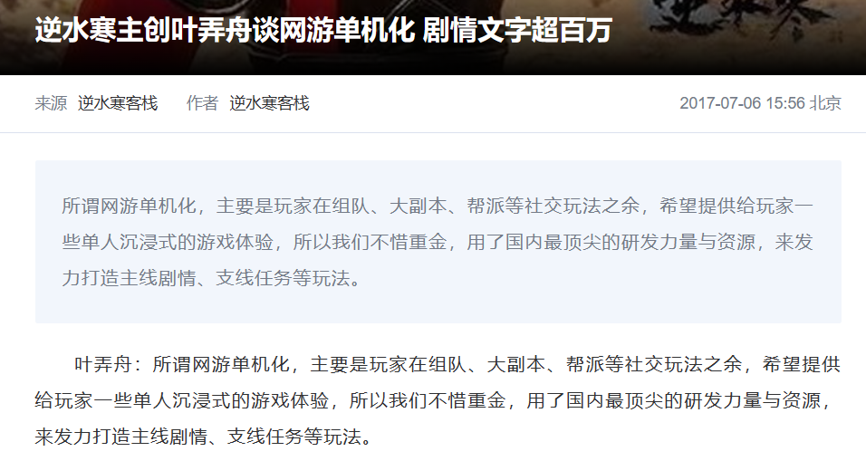 在《逆水寒》刚刚问世的时候,叶弄舟就明确对外谈及了一个“网游单机化”的概念。他希望《逆水寒》是一款在秉承了MMORPG传统,于打副本、组队、帮派等社交玩法之外,能够给玩家们提供能够单人沉浸其中的内容,比如游戏的主线剧情与支线任务。