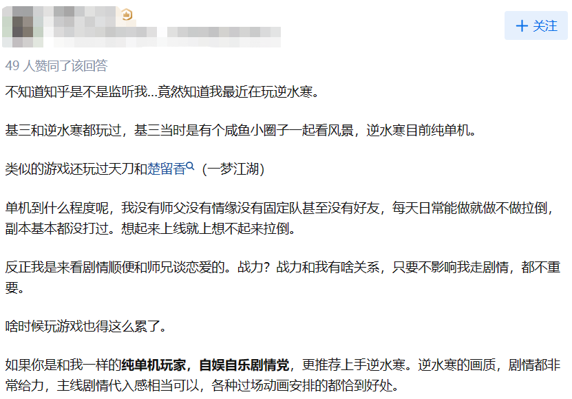 而在知乎上在关于当下哪款武侠游戏更适合单机玩家的问答下,《逆水寒》也是个出现频率颇高的名字。