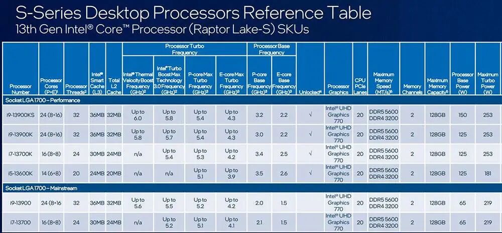 据之前的爆料,英特尔即将在明年1月份发布13代酷睿中的新一款顶级旗舰处理器i9-13900KS。这款处理器最特别之处就在于它将会是全球第一款睿频可达到6.0GHz的处理器。根据曝光的参数,i9-13900KS与i9-13900K一样都是8大16小24核心32线程、32MB二级缓存、36MB三级缓存。主要是频率上的区别,其中,P核大核的基准频率从3.0GHz提高到3.2GHz,睿频2.0加速频率还是5.4GHz,睿频Max 3.0加速频率从5.7GHz来到5.8GHz,TVB睿频频率从5.8GHz提高到6.0GHz。当然小核E核的频率没有变化,依旧是默频2.2GHz,睿频4.3GHz。频率上去了,功耗自然也有所增加,基础功耗从125W增加到150W,幅度20%,而最大睿频功耗保持不变仍是253W。近日,还有爆料人晒出了这款处理器的Cinebench R23跑分成绩,根据爆料的图片,可以看到i9-13900KS的Cinebench R23单核跑分达2366分,多核跑分可达40998分,相比i9-13900K提升5%和3%,比竞品R9 7950X高15%和8%。这么一看似乎提升的幅度也不是特别大,不过值得注意的是i9-13900K的最高睿频就已经达到5.8GHz了。除了桌面处理器外,英特尔13代移动处理器也预计会在下月初的CES展发布,当然本次的移动处理器也是来势汹汹。据爆料本次发布的13代移动酷睿处理器的顶级型号是 i9-13980HX,拥有8大核+16小核,共24核心32线程,睿频可达5.6GHz。而其他的HX系列移动处理器还有i7-13700HX、i7-13650HX、i5-13500HX、i5-13450HX,爆料称HX系列均为桌面端移植而来,规格与桌面端型号相同,基础功耗为55W。13代酷睿H系列则有i9-13900H、i7-13700H、i7-13620H、i5-13500H、i5-13420H等,旗舰型号为i9-13900HK,6大核+8小核设计,睿频可达5.4GHz。而在核显方面,HX系列依然配备了32单元核显,而H45系列则是最多配备96单元核显。