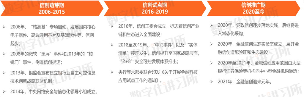 自2020年央行成立金融信创实验室以来,金融行业的信创试点逐渐启动。2022年以来,金融信创建设在在政策引导下全面提速。2022年1月,国务院发布了《“十四五”数字经济发展规划》,明确将“加快金融领域数字化转型”列为七大重点行业数字化转型提升工程之一。2022年1月央行发布《金融科技发展规划》,强调要“注重金融创新的科技驱动和数据赋能,推动我国金融科技从‘立柱架梁’全面迈入‘积厚成势’新阶段,力争到2025年实现整体水平与核心竞争力跨越式提升”。数字化转型离不开信息技术的加持,而信创作为数字“新基建”的重要组成部分,也成为推动我国经济数字化转型的关键力量,金融信创已正式进入全面推广阶段。根据零壹智库、数字化讲习所《核心技术崛起:中国金融信创产业发展报告2021》总结,中国信息化建设起步于20世纪80年代,起初以银行为主的传统机构试点从国外引进大中型计算机及其配套设施,成功后广泛推行。然而全产业链的进口导致了核心环节研发出现技术断层,我国信息技术产业逐渐被国外企业垄断。为了改变这一局面,中国在2006年提出“核高基”专项,计划在2006年至2020年期间,投入千亿元发展国内核心电子器件、高端通用芯片及基础软件等。自此,中国信息技术正式步入自主创新阶段。2013年,“棱镜门”事件爆发,引起各国政府担忧。如何保护关键领域和公民的信息安全问题已然上升至国家层面。其中,党政、金融机构率先开展软硬件国产替代。随着信创建设范围不断扩大,金融领域落地案例由国有大型银行逐渐向中小型银行、非银金融机构辐射。2020年开始,信创在经过多轮创新应用后进入规模化推广阶段。作为建设工作进度较快的领域,党政信创处于落地实践的重要时期,后续将进入常态化采购。在金融领域,信创应用范围由大型银行、证券、保险等机构向中小型金融机构渗透。另外,金融信创生态实验室成立,标志着金融信创正式展开适配验证和生态建设。随着相关案例规模化落地,金融信创在2021年迎来元年。秉持科技自立自强的国家发展战略,我国信创建设“全面开花”。自2018年中美国际局势变化以来,我国明确了“数字中国”建设战略和提出了“2+8”安全可控体系。为了早日实现核心技术国产替代,国家提倡党政机构优先采购自主研发的软硬件。至此,党政领域率先尝试信创产业落地工作。2020年,党政信创顺利完成落地实践并进入推广期,该年也被称为信创元年。2021年,以金融为代表的行业信创迎来元年。随着党政、金融信创局面打开,试点成功的信创产品和服务可以复制到更多的领域。现下,信创应用领域在“2+8”体系的基础上扩展至“2+8+N”体系。除了在原来的党政和八大民生行业实践应用,信创也开始与实业结合,为“十四五”规划中信息化与工业化融合提供落地案例。根据零壹智库、数字化讲习所对工信部及下属机构、地方经信委等职能部门公开的优秀信创案例情况测算,截至2021年12月底,信创落地应用进展最快的分别为党政领域和金融行业,落地实践率(注:指在公示的信创案例中,对应行业开展信创应用并有真实落地的案例占所有案例的比例)分别为57.01%、29.55% ;其次,交通、能源、教育和电信等行业也正在加速信创案例落地并向第一梯队靠拢;医疗、工业两个行业信创建设处于探索阶段。受国际形势的影响,在国家政策的大力支持下,信创开始在全国范围内快速落地。各地方政府为跟紧时代潮流,促进当地高新技术发展,相继出台了信创相关政策。2018年以后,各地方政府对信创相关业务的招标工作也呈现上升的趋势,对信创的重视程度有较大的提高。由于信创行业还未全面铺开,2021年,各地方政府对信创产品的采购主要偏好IT基础设施类产品,主要包括信创计算机和信创打印机等硬件设施的采购,不同地区的政府对于信创产品的偏好程度有着较为显著的区别。信创在党政试点工作已转向常态化采购,这表明国产软硬件已经可以满足特种行业的基本需求。党政信创在政策的驱动下取得了阶段性的成功,这为之前勇于“啃硬骨头”,攻克“卡脖子”技术的厂商建立了信心,也为其他领域厂商树立了标杆。2020年,大规模兴起的数字化转型与信创逐渐趋同进而并轨。2021年,金融信创迎来元年。金融信创是金融机构和科技厂商双向选择的结果。作为金融机构,信创属于“一把手”工程。机构领导统筹带队信创建设,根据国泰君安的数据,头部金融机构已经建立起数百人的专业信创技术团队,并将国产基础软硬件采购支出占比快速提升至20%以上,未来仍将加大投入。对于国内科技厂商,信创不仅为他们天然地规避了一些国外竞争对手,还打开更大的行业应用市场的大门。之前党政试点对参与厂商资质审核严格,科技厂商参与度有限。在进入金融类市场化行业后,科技厂商可以根据金融机构的个性化需求来提供适配的自主研发产品或服务。一般情况下,金融信创建设工作包括可行性课题研究、实施方案确认、招标采购、项目建设、测试与试运行,及培训与运维等流程。项目采取自主或者与厂商合作的形式进行。为了更加了解金融信创建设进程,零壹智库在招投标网站和公司官网等,通过“信创”、“国产化”等关键词筛选出173条招投标数据。需要说明的是,本次报告分析均依据上述数据。由于数据可能存在缺失或