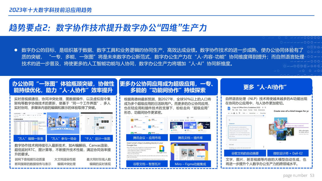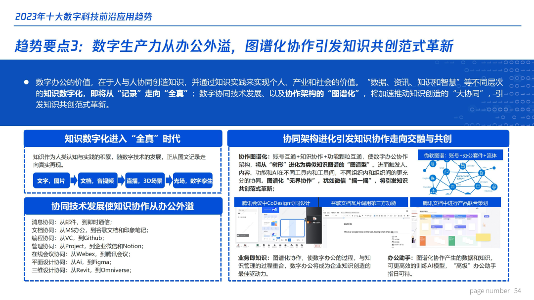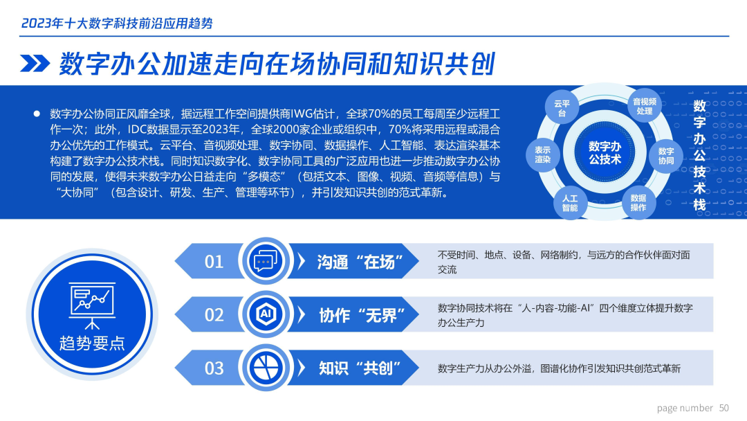 云平台、音视频处理、数字协同、数据操作、人工智能、表达渲染基本构建了数字办公技术栈。同时知识数字化、数字协同工具的广泛应用也进一步推动数字办公协同的发展,使得未来数字办公日益走向“多模态”(包括文本、图像、视频、音频等信息)与“大协同”(包含设计、研发、生产、管理等环节),并引发知识共创的范式革新。