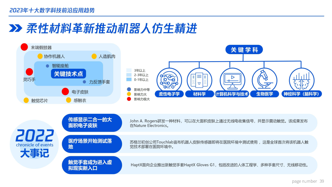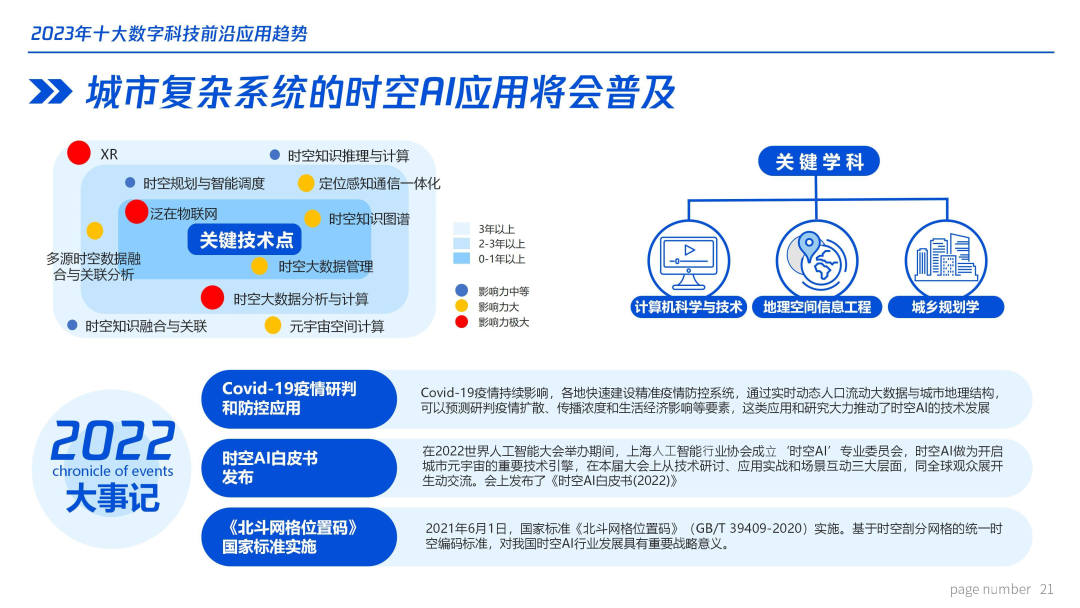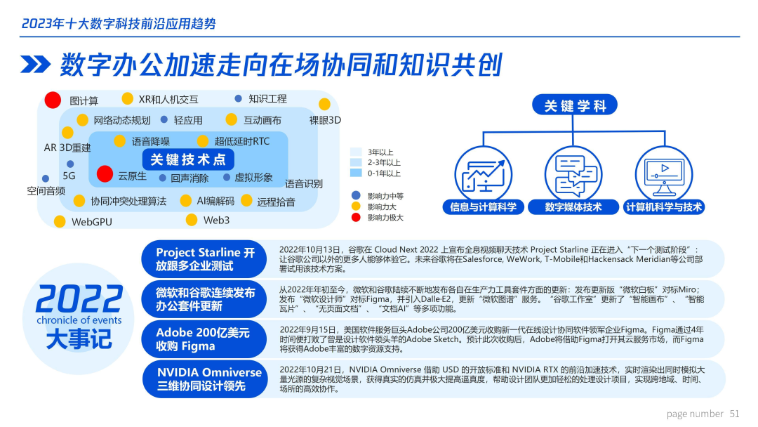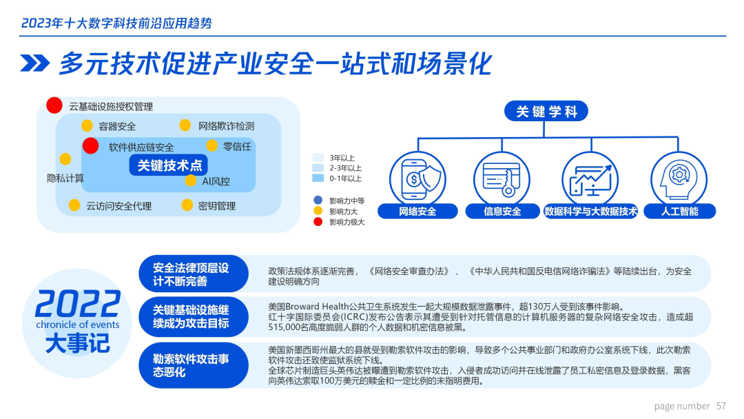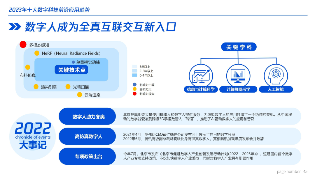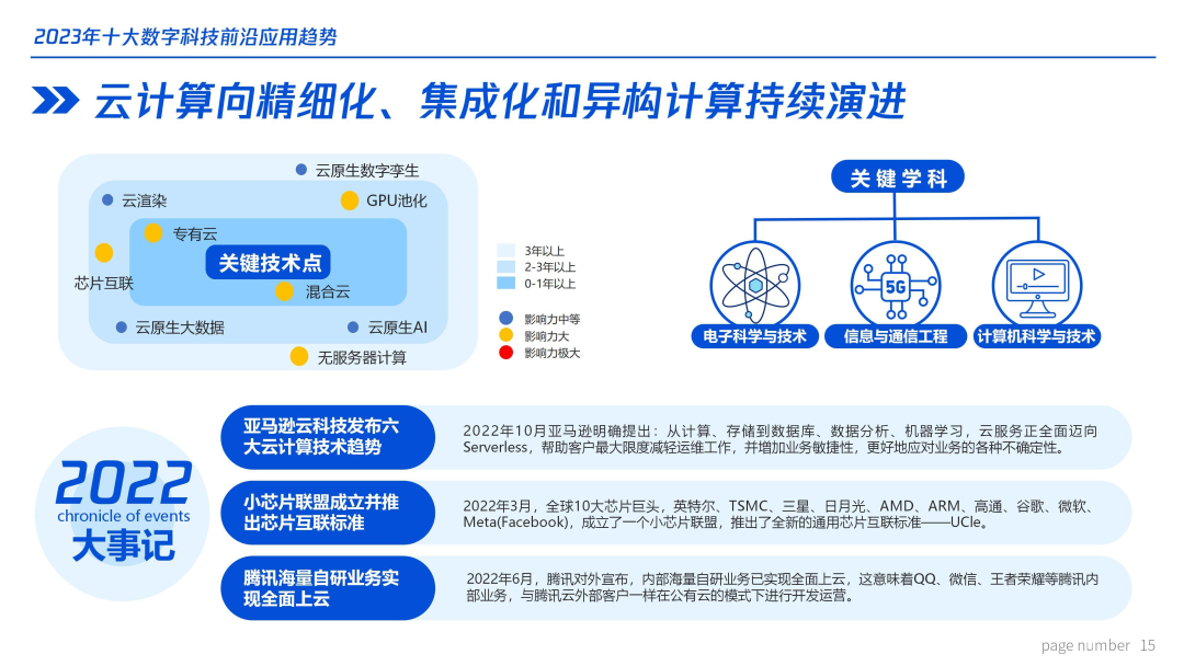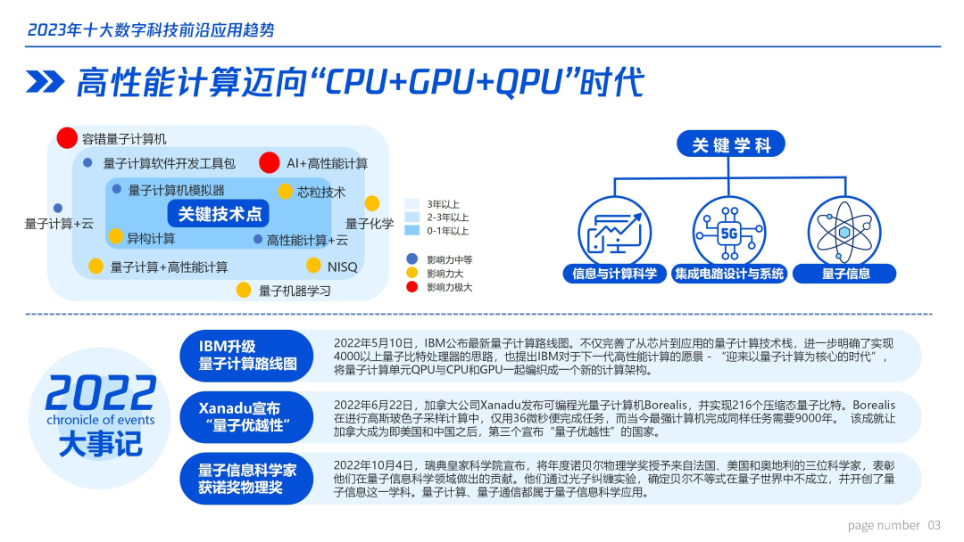 继21年的“变量”、22年的“融合”,我们看到2023年数字科技的发展呈现出明显的“升维”特征。因此,我们将新一期的报告命名为《升维 - 2023年十大数字科技应用趋势》。报告从数字科技的科研突破、重大事件和创新应用等方面,对高性能计算、泛在操作系统、云计算、数字人、时空人工智能、能源互联网、Web3、机器人、数字办公、产业安全共10个热点方向进行了深入分析,洞察前沿科技的重点趋势。