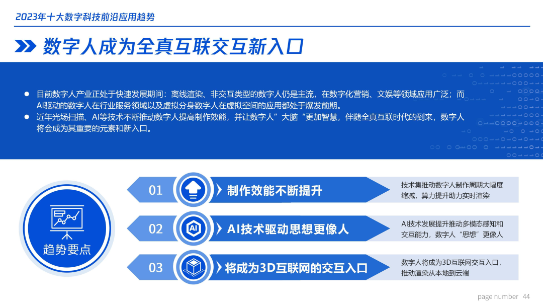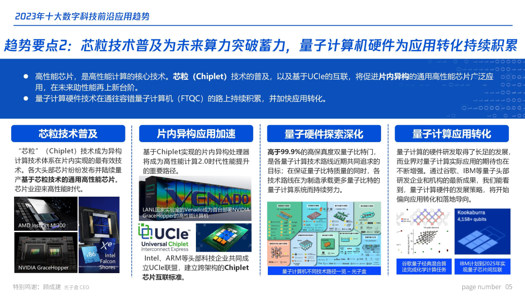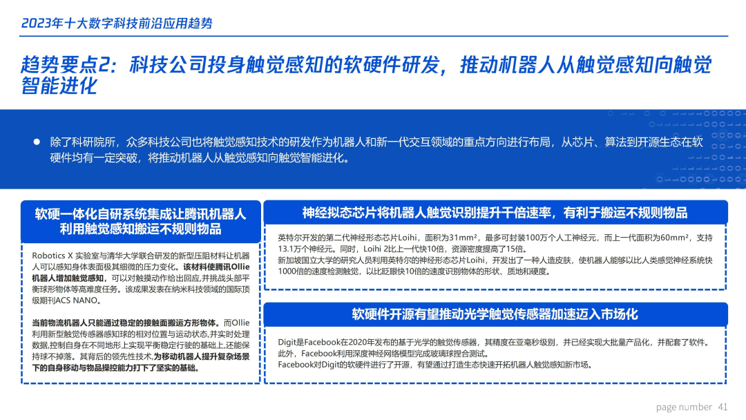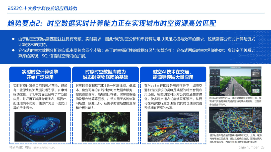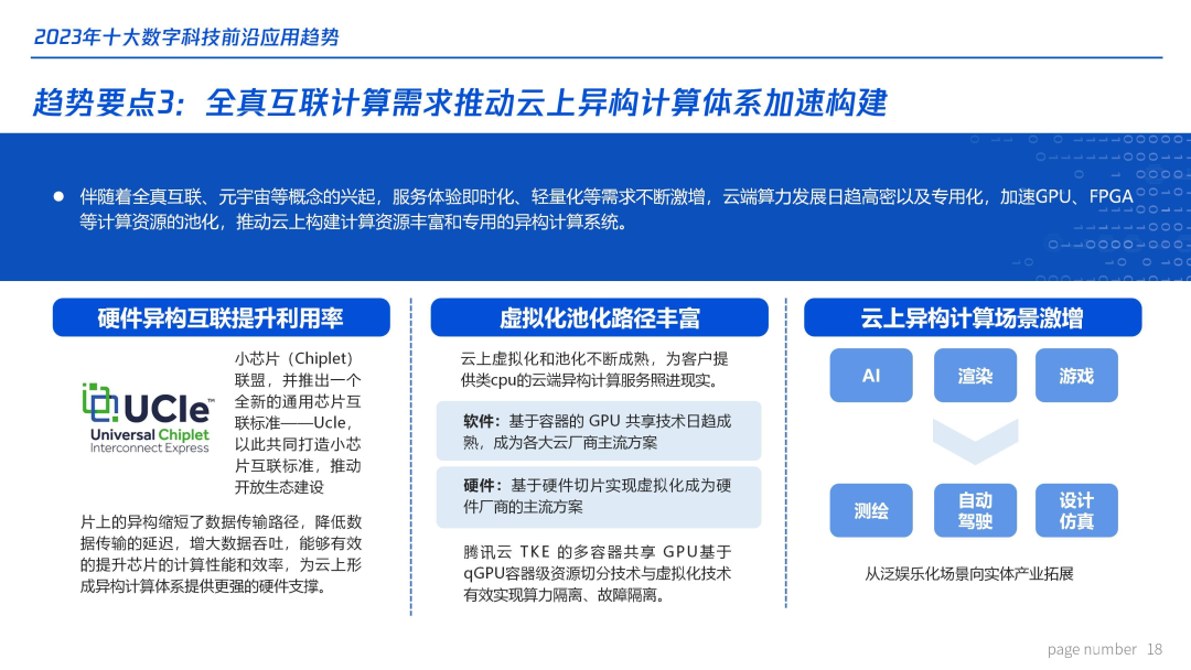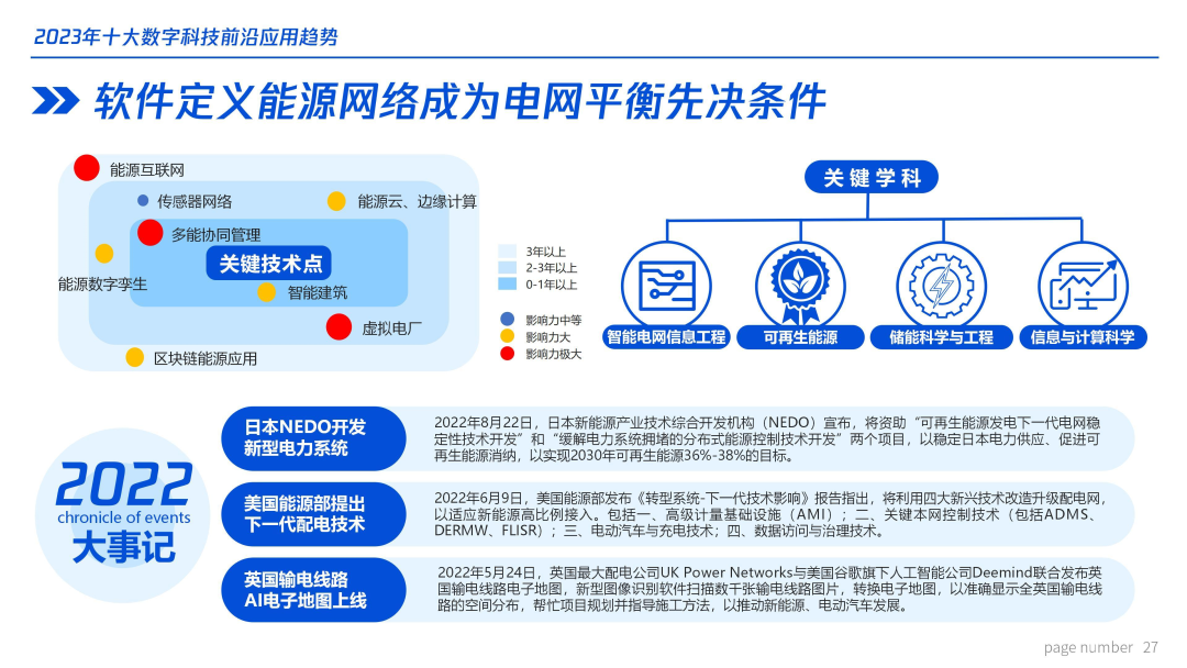 继21年的“变量”、22年的“融合”,我们看到2023年数字科技的发展呈现出明显的“升维”特征。因此,我们将新一期的报告命名为《升维 - 2023年十大数字科技应用趋势》。报告从数字科技的科研突破、重大事件和创新应用等方面,对高性能计算、泛在操作系统、云计算、数字人、时空人工智能、能源互联网、Web3、机器人、数字办公、产业安全共10个热点方向进行了深入分析,洞察前沿科技的重点趋势。
