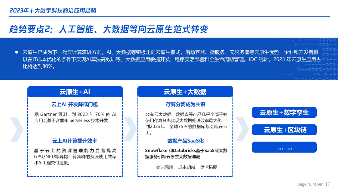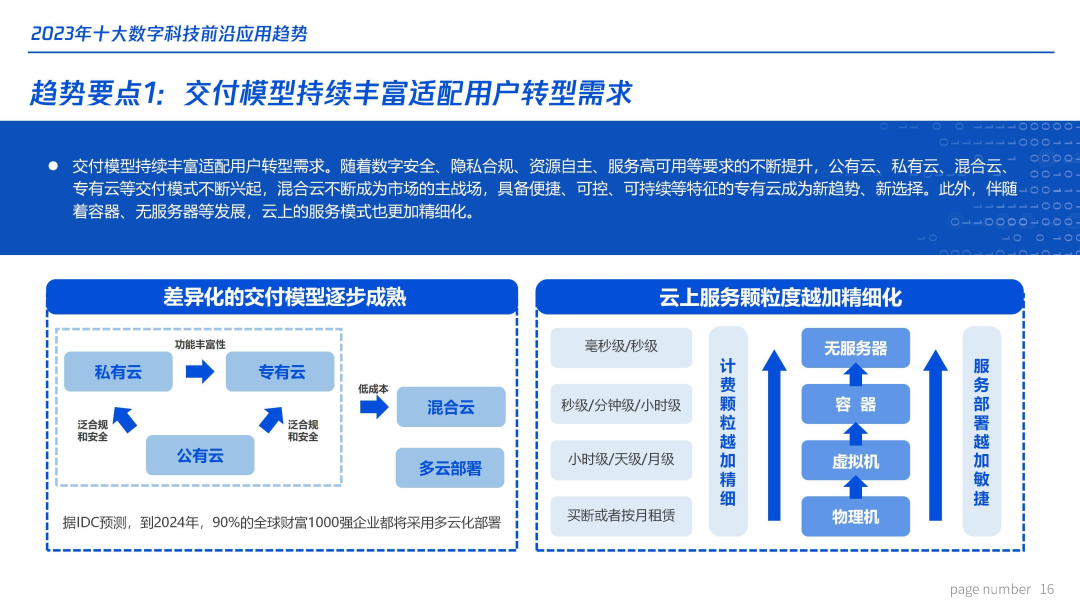 云平台从计算、网络、存储等基础能力的提升,到大数据、人工智能、数字孪生、AR/VR等数字技术与云紧密耦合形成云原生服务, 再到混合云、专有云、无服务器计算、分布式云等不断形成精细化的交付模型,并伴随全真互联的需求,云上融合GPU、DPU等加速形成丰富的计算服务,云计算不断向精细化、集约化和异构计算演进。