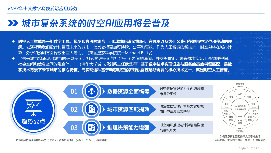“未来城市将涌现出城市的信息空间,打破物理空间与社会空 间之间的隔阂,并交织重组。未来城市实际上是物理空间、 社会空间和信息空间的融合体。”(清华大学城市规划系主任武廷海)基于数字技术实现设施与服务的高效供需匹配,是数字技术背景下未来城市的核心特征。而实现这种基于动态时空的资源供需匹配所需要的核心技术之一,就是时空人工智能。