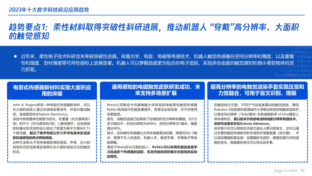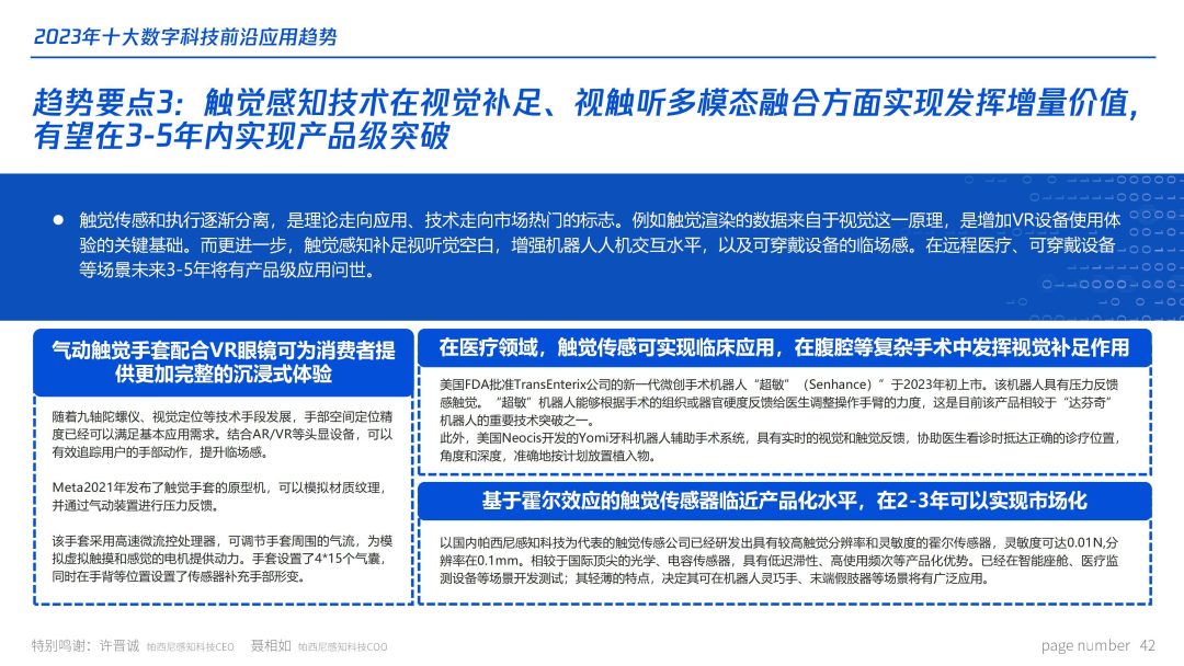 未来1-3年,随着柔性电子技术和机器学习算法的进步,触觉传感器的空间分辨率和精度有望大幅提升。对于提高机器人灵巧操作水平、带来人机交互体验升维意义重大,从而进一步拓展智能机器人应用空间和服务能级。包括工业机器人遥操作、医疗手术机器人、仿真培训、空天探索、智能座舱等场景将更多补足触觉感知,向将向虚拟现实下一代交互终端、末端假肢器等场景扩展。