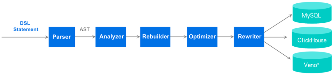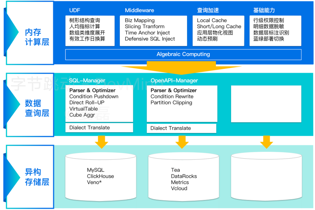 可插拔的异构存储设计,使数据选型得以在业务、数据、效率三者之间寻得平衡点。当前引擎支持 SQL 类、OpenAPI 类两大存储,未来还将支持 Graph、NoSQL 两大类。SQL 类因各数据库支持的 SQL 方言不同,进一步细分为 MySQL、ClickHouse、Slardar-Veno;OpenAPI 类支持 DataRocks、Tea、Metrics 等公司内部平台所开放的各类 OpenAPI。
