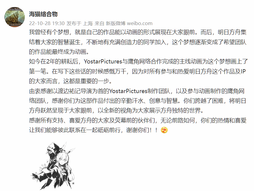 在《黎明前奏》上映之前,《明日方舟》的制作人——海猫络合物,发布了一条致谢的微博。