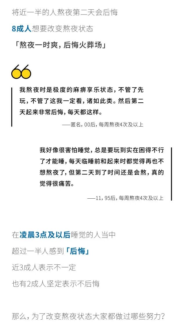 一方面,人们对于熬夜对身体的负面影响非常清楚。不少人在问卷中提到了他们蜡黄的脸色、稀疏的头发、昏沉沉的脑袋、隐隐作痛的心脏,严重者甚至有过 「眼前一黑」「突然胸口像撕裂了一样痛,透不过气来」等危险时刻。