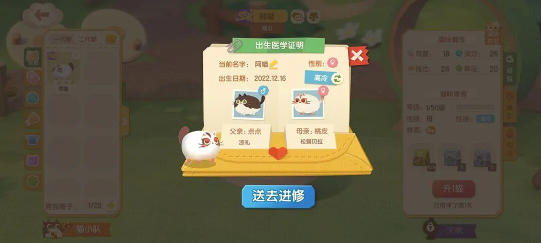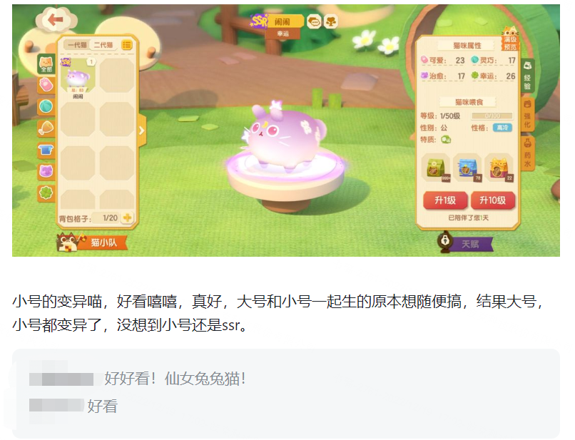 这是游戏里的遗传玩法。猫二代有几率继承父母双方的花色和性状,运气够好,就能凑出一只美若天仙的六边形战士。开服才刚没几天,游戏评论区里就出现了大量猫二代的美照,引发各路猫家长争奇斗艳。