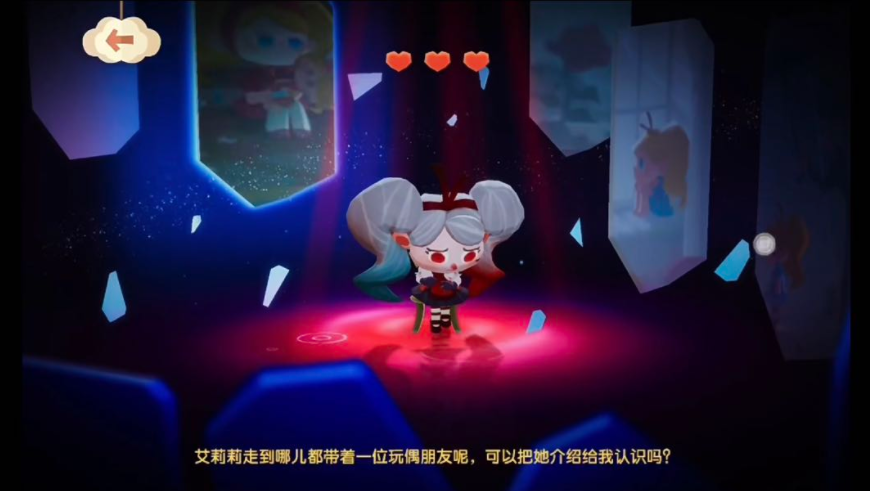 当玩家集齐了当前的故事线索,艾莉莉则开始显露出自己负面的情绪,房间的背景则会转为哥特风格的红黑配色,行为模式也会做出相应的改变。最终解开心结的环节,玩家要面对脆弱艾莉莉一次又一次的质问,将心灵的枷锁步步击穿,最终才发现自己是艾莉莉的上锁人。在艾莉莉的心结解开后,房间的装扮也会再一次发生改变,焕然一新成粉白的明亮配色。